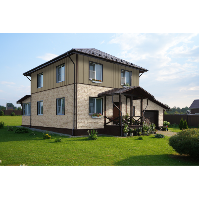 Фасадные панели могут использоваться как для оформления фасада целиком, так и для облицовки фундамента, выделения отдельных деталей.