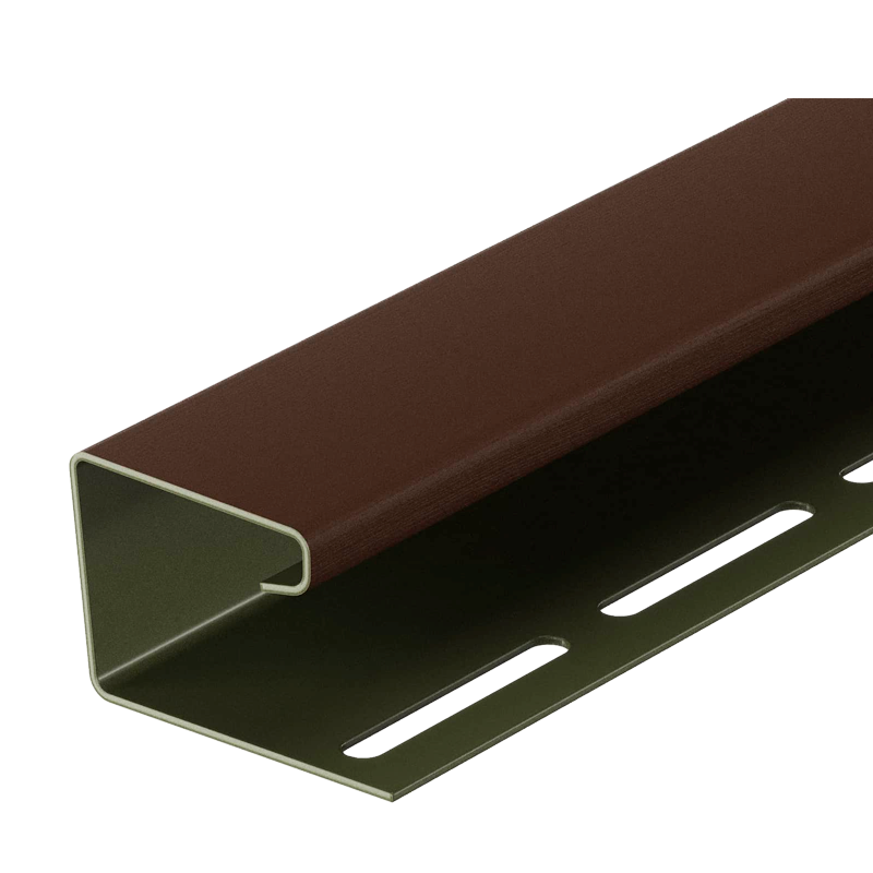 Универсальный виниловый J-профиль от Docke длиной 3 м, цвет Каштан. Используется для оформления мест стыков крыши и фронтона, при отделке оконных и дверных проемов, в качестве приемного профиля для софитов, а также как декоративный и защитный угловой элемент.