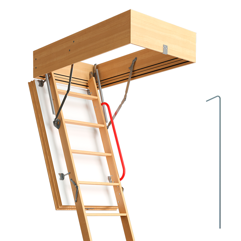 Лестница Docke LUX устанавливается в потолочный проем 70x120 см и подходит для помещений с высотой потолков до 3-х метров. В комплект поставки входит металлическая фурнитура, запорный замок, ручка - ключ. При необходимости дополнительно можно приобрести поручни и наконечники на ножки.