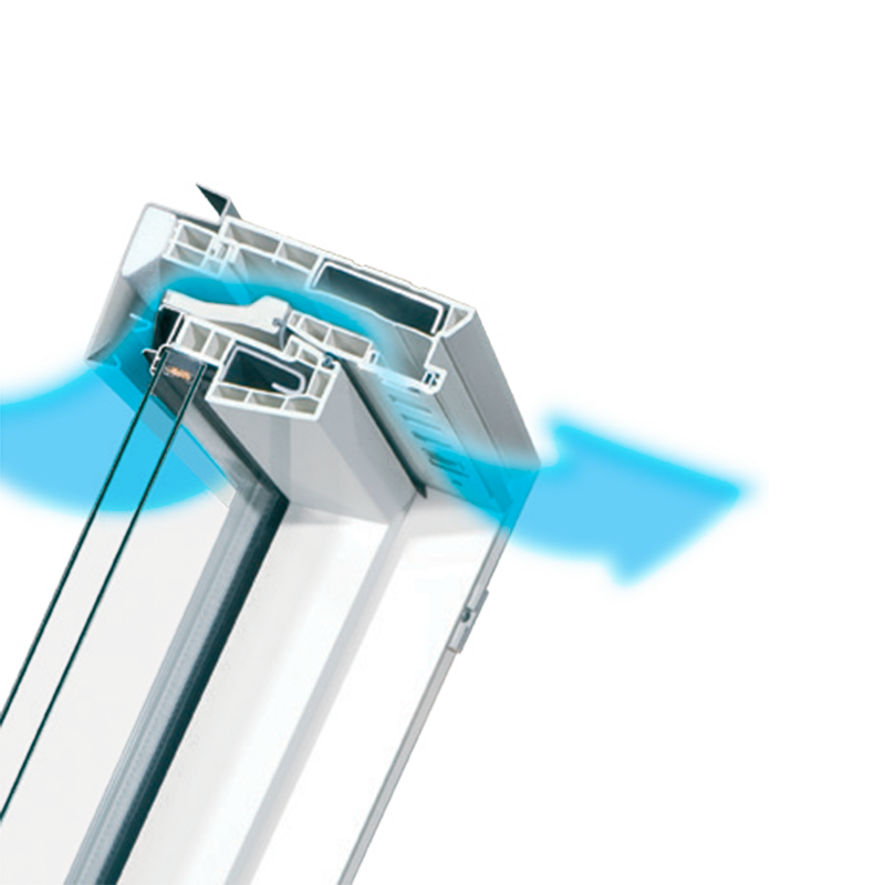 В верхней части оконной рамы установлен автоматический вентклапан V40P, который позволяет оптимизировать приток свежего воздуха в помещение. За счет лабиринтообразного строения клапана перемешивание холодного воздуха, поступающего с улицы, с теплым воздухом происходит внутри вентклапана, что предотвращает образование конденсата на внутренней стороне стеклопакета.