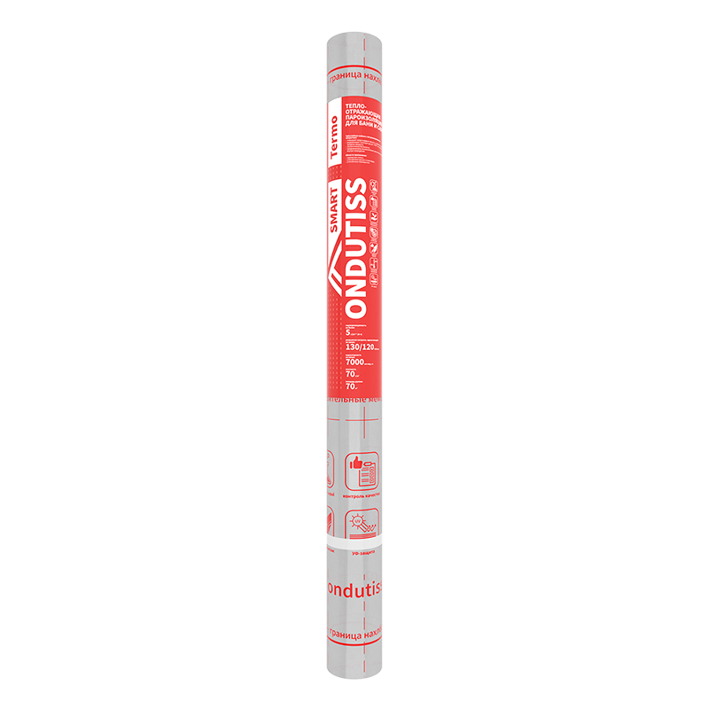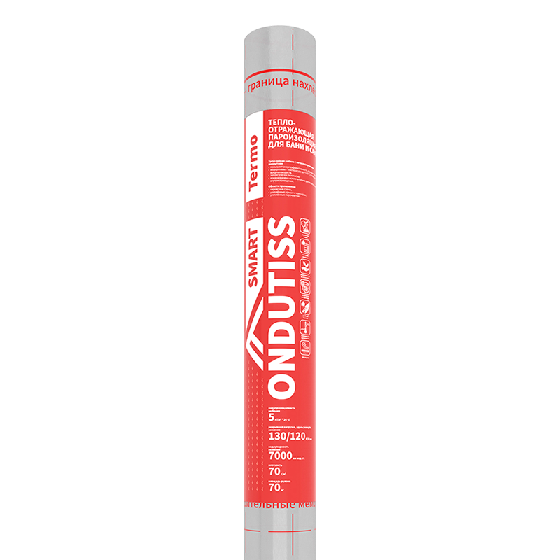 Специальная трехслойная отражающая пароизоляция для бани и сауны. Имеет металлизированное покрытие, температура применения –40…+120 °С без выделения вредных веществ при нагреве. В отличие от других пленок Ondutiss SMART не имеет интегрированной монтажной ленты. Близкий аналог — Ondutiss R Termo (до 2023 г.)