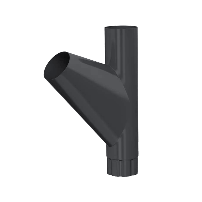 Тройник трубы D100 мм темно-серый RAL7024 с покрытием Пластизол серии МП Престиж от Металл Профиль. Применяется для соединения двух водосточных труб в один общий сток.