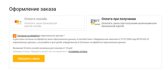 Вы можете оплатить заказ при получении или банковской картой онлайн. Выберите подходящий вам вариант из верхних вкладок, заполните необходимые поля и нажмите «Оформить заказ».